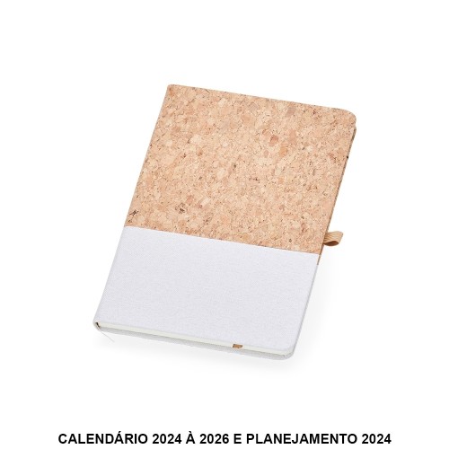 Caderneta A5 de cortiça personalizada com detalhe em linho e suporte para caneta, contém marcador de página em cetim, página para dados pessoais, calendário, páginas de planejamento e aproximadamente 92 folhas marfim com pauta.