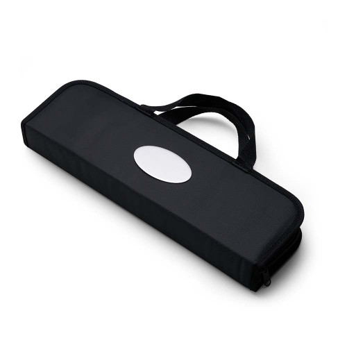 Kit Churrasco personalizado com17 Peças em estojo de nylon com alça. Contém: pegador, garfo, espátula, faca, pincel, 4 espetos e 8 garfos pequenos para petiscos. Utensílios de inox com proteções plásticas e parte interna com velcro para fixação das peças, acompanha plaquinha metálica para personalização.