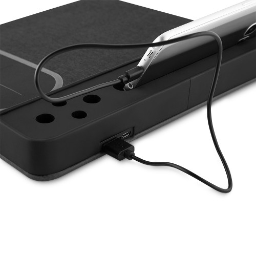 Mouse pad com carregador por indução personalizado. Material confeccionado em Poliuretano e Poliester, possui suporte para canetas e celular na lateral, possui indutor(não sendo necessário o uso de fios, para este modo é necessário que o tablet ou smartphone tenha a traseira de vidro e tecnologia QI, caso contrário o carregamento será apenas através de cabo), parte inferior com borracha anti-deslizante. Acompanha cabo usb.