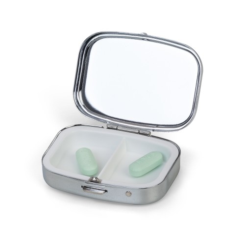 Porta comprimido Personalizado de metal, parte superior(tampa) brilhante externo e interno e lado inferior com detalhes estilo mosaico.