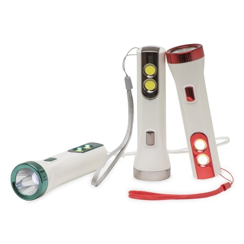Lanterna plástica personalizada recarregável de um led com 3 estágios de iluminação e dois leds lateriais com função luminária.