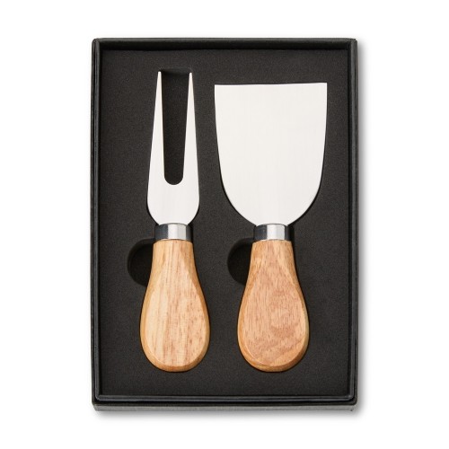 Kit de Queijo personalizado com 2 peças, embalado em um estojo de papelão com berço de espuma, contendo um garfo e uma espátula. Para aproveitar com qualidade aquele momento especial. Confira essa novidade