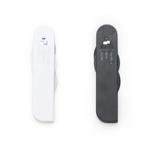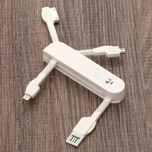 Cabo de dados personalizado em formato canivete plástico, serve também como carregador USB. Possui cabos adaptadores para: Iphone 5, Iphone 6, Android e Iphone 4. Parte frontal possui descrições ao lado do botão: For iP5 / 6, Micro e For iP4. Basta deixar o botão posicionado conforme o modelo do seu aparelho para fazer o uso.