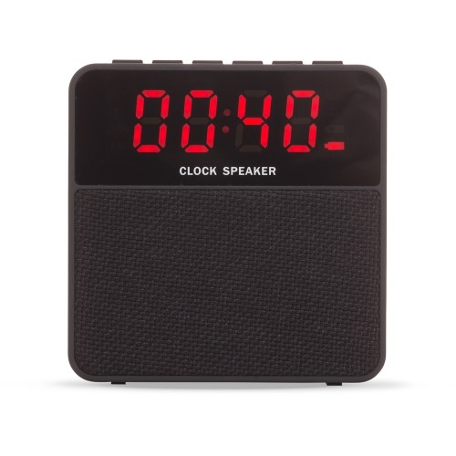 Caixa de Som personalizada Multimídia com relógio digital. Material emborrachado com display superior frontal, tela de proteção dos falantes em tecido, parte inferior com borrachas anti-deslizantes. Possui botões de Relógio/Alarme; Telefone/Atender chamadas; Mode; - retroceder/diminuir; + avançar/aumentar; Play/Pause/Troca; Microfone; Botão on/off; Entrada auxiliar P2; Entrada DC 5V; Entrada USB e Entrada TF (cartão MicroSD). Acompanha cabo USB e manual de instruções em chinês/inglês.