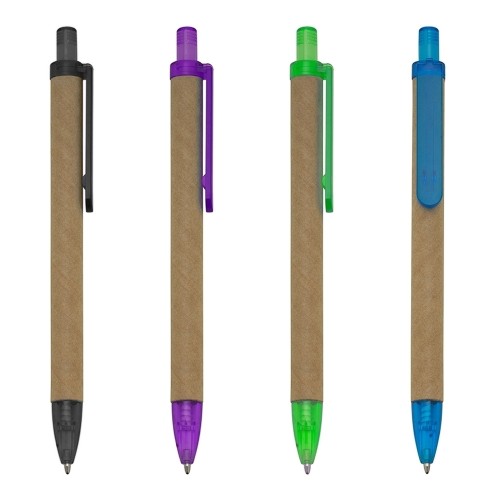 Caneta ecológica personalizada de papelão com detalhes em plástico translúcido. Aciona por clique, carga esferográfica na cor azul.