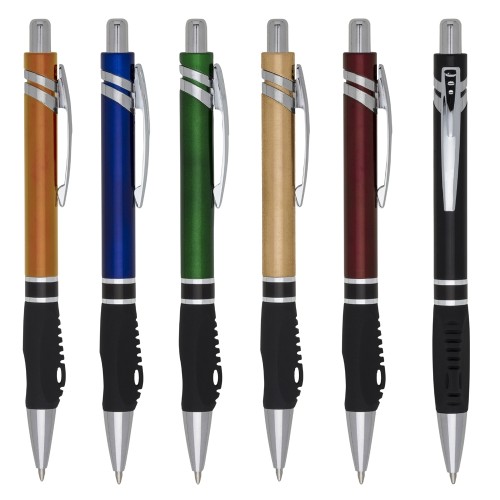 Caneta plástica inteira colorida Personalizada com detalhes em prata.