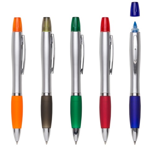 Caneta plástica com marca texto Personalizada , corpo prata com anel inferior e detalhe emborrachado colorido.