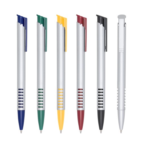 Caneta plástica corpo prata com detalhes coloridos. Clip plástico colorido e parte inferior com sete linhas coloridas. Aciona por clique.