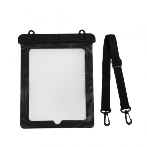Capa personalizada impermeável para tablet. Frente e verso transparente com contorno quadrangular fosco, suporte plástico preto com fivelas rotatórias (basta rotacioná-las para abrir o case). Possui alça de nylon ajustável com fivela plástica.