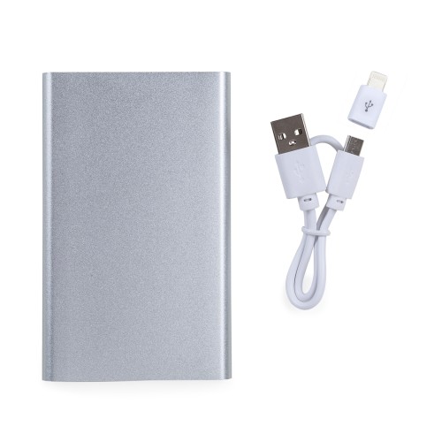 Power bank Personalizado de metal com indicador de carga em led. Corpo metálico de design fino com detalhe branco nas laterais, “entrada” e “saída” de 5v, 4 indicadores de carga em led azul e botao liga/desliga, 2000mAh. Acompanha cabo USB e adaptador Lightning(IPHONE).Ver menos