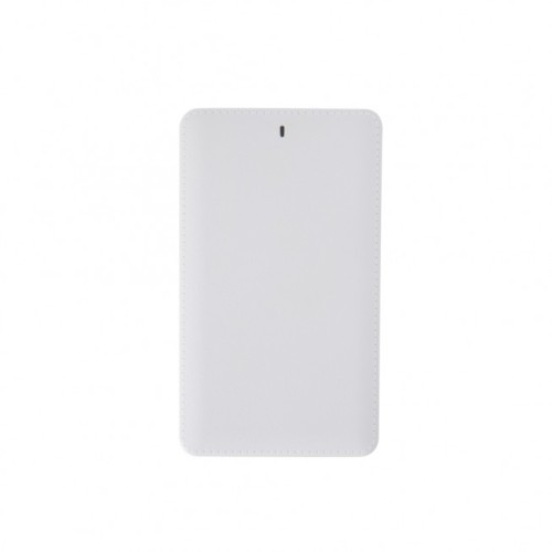 Power bank personalizado plástico com capacidade de 2000mAh. Com um design fino, seu material plástico é texturizado e lembra um couro. Possui luz led indicativa; possui adaptador Lightning (para Iphone) acoplado na parte interna/abaixo do cabo. Acompanha cabo USB.