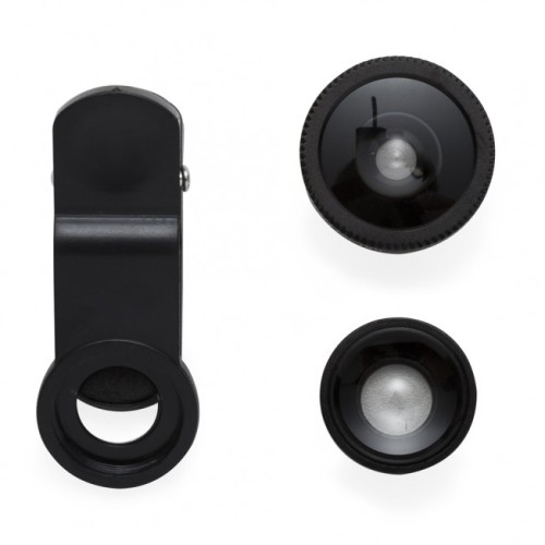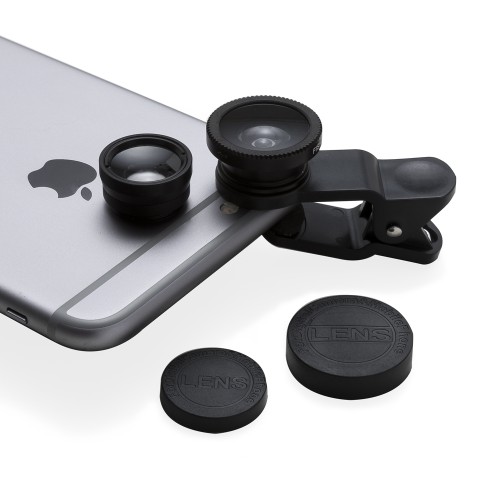 Conjunto universal personalizado de lentes para celular. Possui lente fish eye, lente macro, lente wide angle e prendedor Basta rosquear as lentes no prendedor e posicioná-lo na câmera do celular para seu funcionamento. Acompanha veludo para guardar os itens.