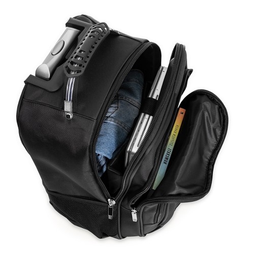 Mochila personalozada de carrinho com padrão para bagagem de mão, conforme especificações IATA (Associação Internacional de Transportes Aéreos). Confeccionada em nylon, contém alça de mão com pegador emborrachado com cabo de aço interno para garantir maior resistência, puxador retrátil com regulagem e botão acionador, alças para as costas escondidas no compartimento traseiro com zíper, compartimento mediano com divisórias para documentos e canetas, compartimento frontal pequeno e bolsos laterais em malha. O compartimento principal possui bolso para notebook até 13.3 polegadas e forro com zíper. Possui duas rodinhas e freio em plástico, além de um sistema velcro para junção do compartimento das alças com a parte inferior, tampando as rodinhas enquanto transporta a mochila nas costas.Ver menos