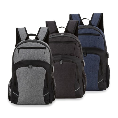 A mochila possui alça de mão, alças para as costas reguláveis com revestimento espumado e pequenas faixas reflexivas na área frontal.