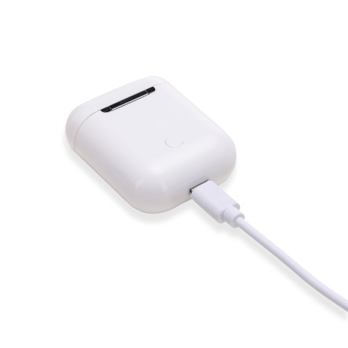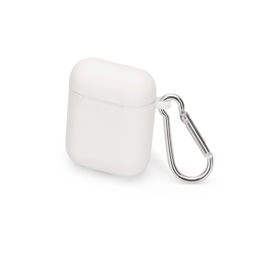 Fone de ouvido personalizado bluetooth com case carregador de fechamento magnético, acompanha capinha de proteção emborrachada para o case, suporte mosquetão e cabo USB Lightning.