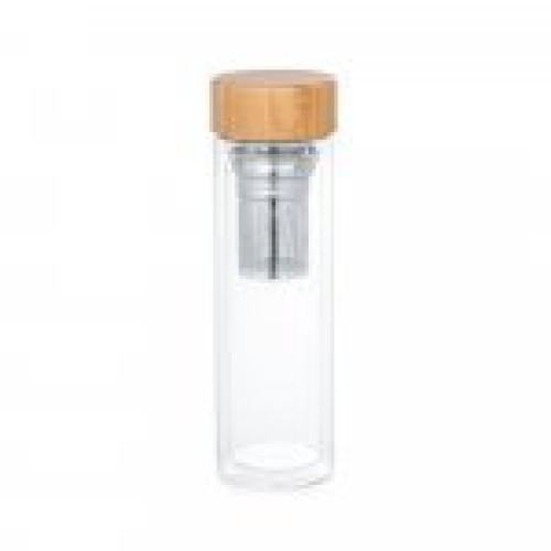 Garrafa Personalizada de vidro duplo com 2 infusor de inox com microfuros e tampa de bambu. Com capacidade de 490 ml. Ideal para preparar seu chá em qualquer lugar de forma prática e rápida. Design e funcionalidade em um só produto.