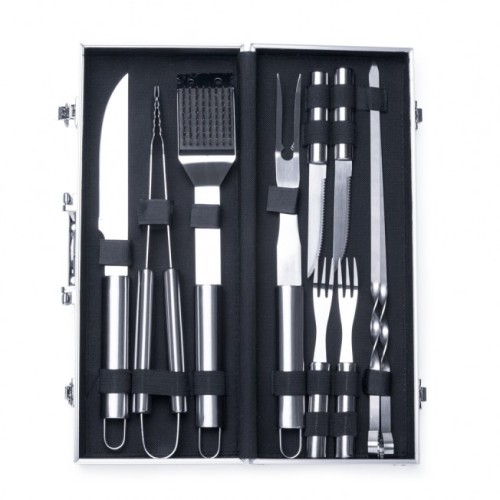 Kit churrasco Personalizado ,10 peças em maleta de alumínio com relevo. Possui: faca, pegador, escova(com proteção plástica), garfo, duas facas de serra pequenas, dois garfos pequenos e dois espetos. Detalhes em metal nas bordas da maleta, duas dobradiças na parte inferior, uma alça e duas presilhas para travar/abrir maleta. Parte interna revestida de tecido tnt e velcro para guardar as peças.