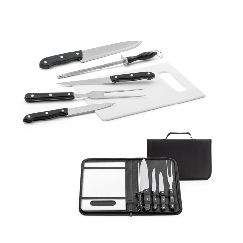 Kit churrasco personalizado em estojo de nylon 210D. Composto por tábua em PP e 5 utensílios em aço inox e PP: faca chefe, faca boning, faca pequena, garfo e afiador. Próprio para contato com alimento. Estojo: 350 x 230 x 40 mm | Tábua: 283 x 192 x 5 mm