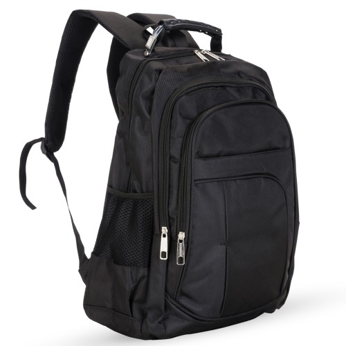 Possui compartimento grande com bolso interno para notebook, dois compartimentos médios, bolso pequeno frontal e bolsos laterais de rede.
